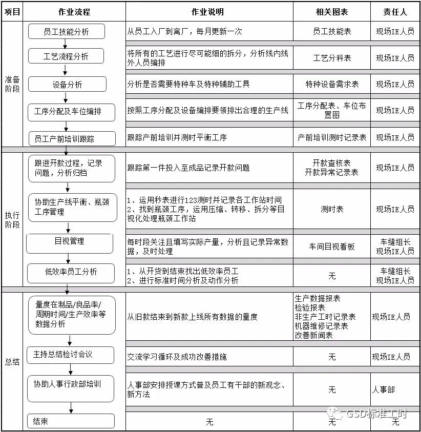 产前准备1、制定每组车工技能表及每人达成率;2、取得工艺分科表,进行设备用量评估;3、特种车的到位及调试跟踪;4、进行工序分配及制作机器排位图;                               5、与计划部制定每日生产目标;6、转款事项核查及跟踪产前培训;                                 7、辅助组长机器排位;8、参与及督促产前会议;单件流生产管理1、跟踪开款,记录转款时间<统计障碍因素>,填写开款核查表,不定期开展障碍清除会议;2、开款首个工作日内进行测时,找出瓶颈,进行工序平衡;3、督促每天早会质量,跟踪当天生产目标,参与缺席安排及针对最低效率三名员工商讨提升效率方法;4、各工作站最少要在4小时内平衡及达到生产目标,利用解决瓶颈的基本思想,也可利用全能工及其它工人,重新拆分问题工序或调动衣车位置;5、辅导收发工作,如全组未达到预期目标而又无生产平衡问题,要注意第一工序的时间有否达到目标或比后工序长,并督促员工加快进度;6、不断找寻最低产量工序,逐一提升产量,使全组产量不断增加;     7、进行标准工时研究及动作分析,如有问题,提出意见并跟进结果;8、核查目视看板及电子看板的正确填写;
